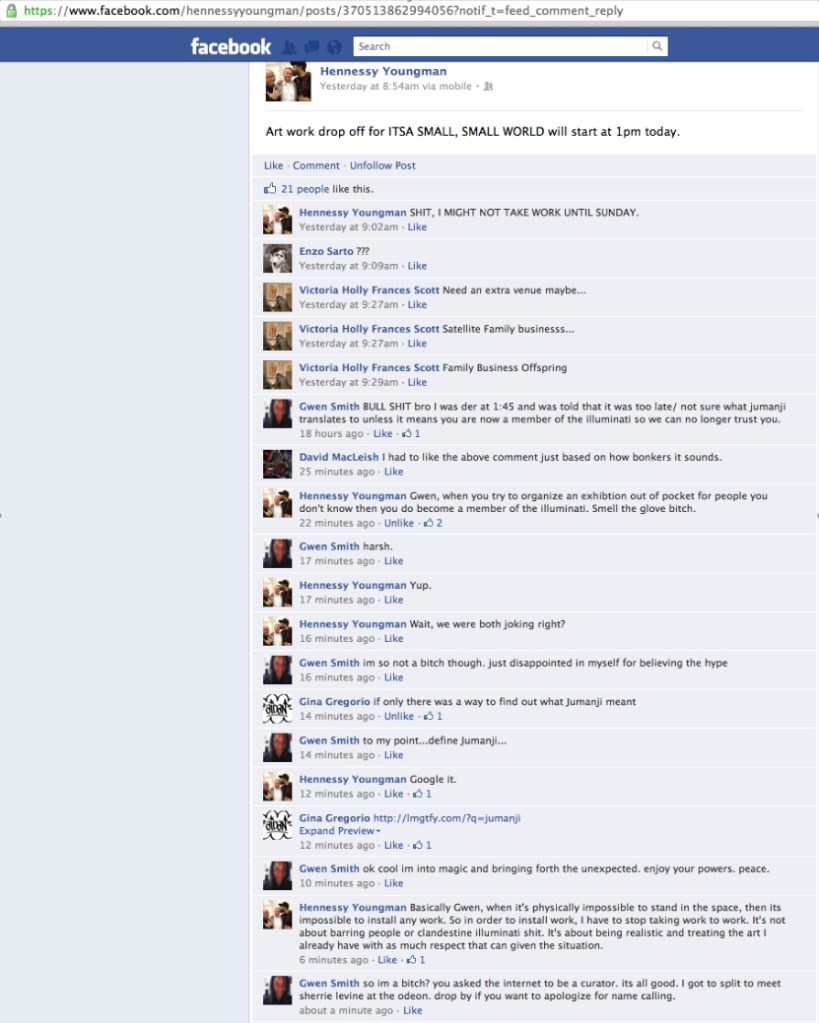I want to follow up on my struggle to be defined as an ARTIST with the facebook dialoge/argument that I had with Hennessy Youngman over his re-nigging of the call to curate ARTISTs who could bring work to his part of the ‘Virgins’ exhibition.