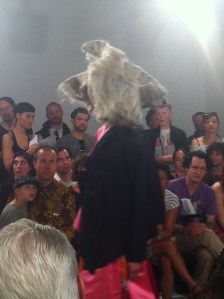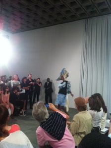 Sunday being a good MOTHER I got my son a playdate so he wouldnt have to endure the Whitney Bi-ennial outing that his parents were going on. When we arrived there was a que for tickets but we managed. K8 Hardy was having a performance and it was “sold out” which was basically away to create a buzz around the event. We stood in line and chatted with friends until we were permitted inside of the peformance space which was the 4th floor of the museum. It was set up like a fashion show and that is indeed what we witnessed.