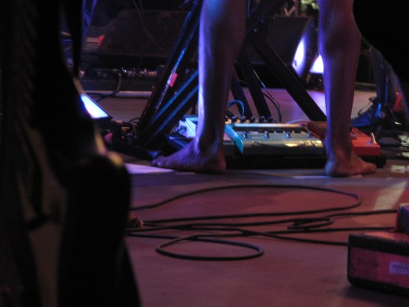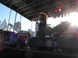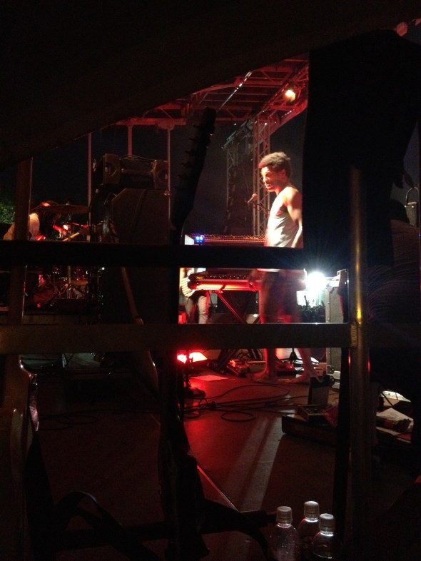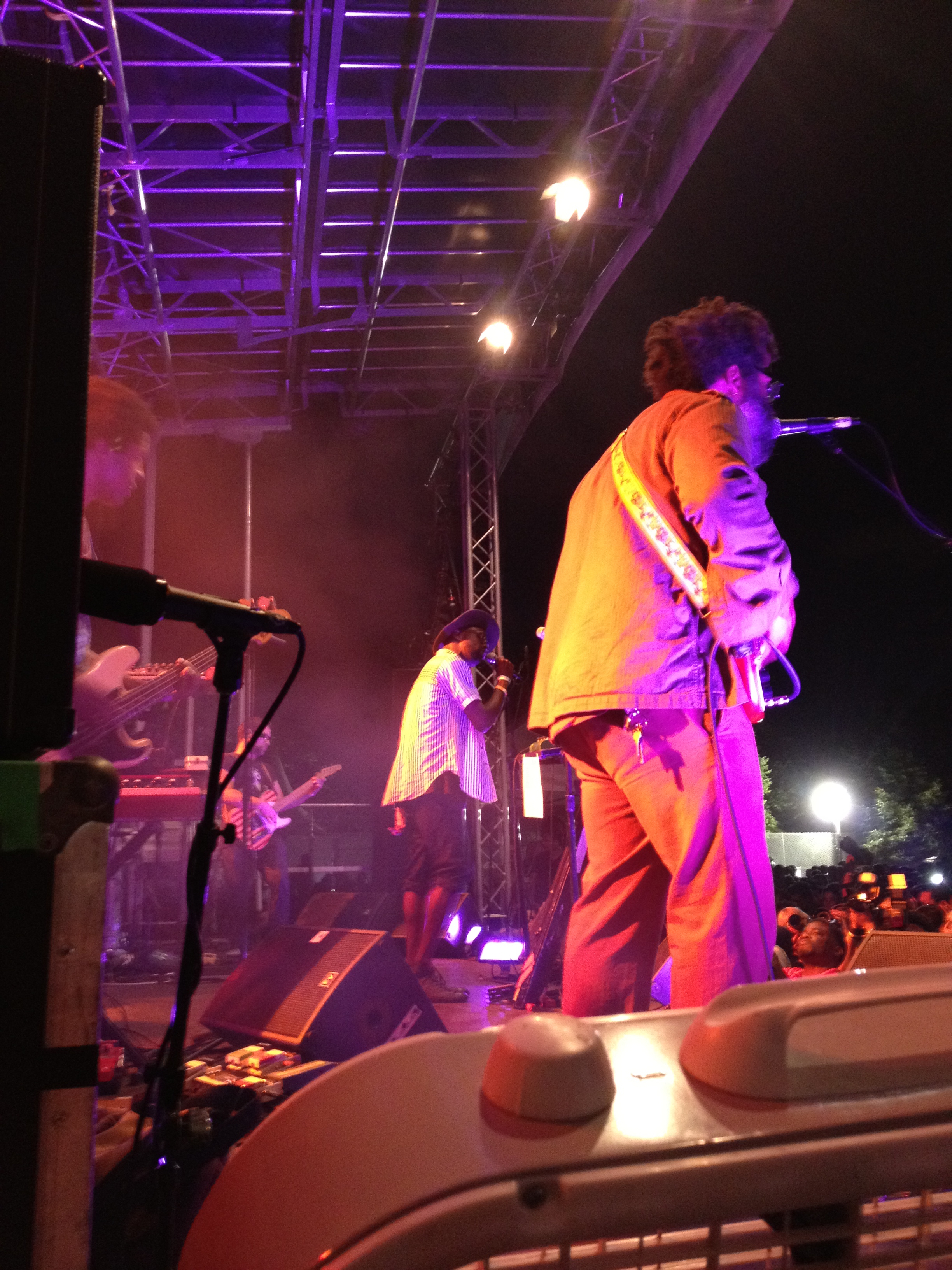 as the members of the band began to arrive the giddy~ness increased. Caught in the wave as though we were one of the ARTISTs. Backstage was a buzz, Jaleel was cruising around jamming on his bass etc (I didnt get a photo but Rbt did) and then suddenly over the PA we heard the announcer say ” ladies and gentleman TV on the Radio” and they walked up onto the stage… Uh~ we remained momentarily stranded at the picnic table where we were left gawking ~ opened mouthed, still crossed legged, and stunned. Jumping up to take our planned position~ too late, naturally the photographer’s pit was jammed ~blocked and guarded by a handsome stern member of the nation of Islam. I found a spot on the extreme side of Kyp, on a riser, behind a fan…